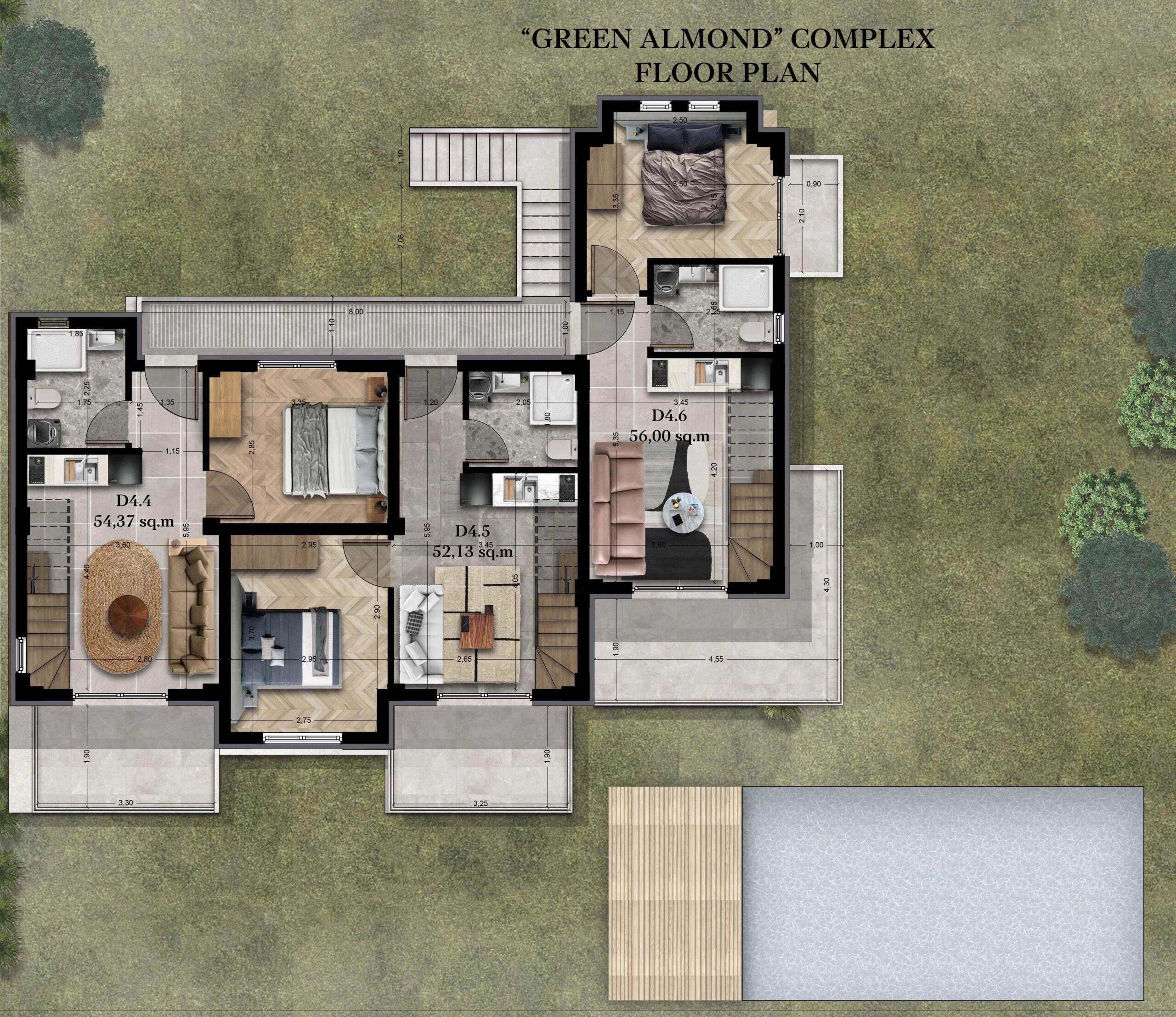 Каждая квартира предоставляется  с кухонной мебелью и мебелью для ванных комнат, центральной входной дверью повышенной безопасности и пластиковыми рамами с ширмами. В поселке также есть зеленые зоны и парковочные места, а каждый владелец  может пользоваться одним из общих бассейнов, относяшихся  к  его квартире.