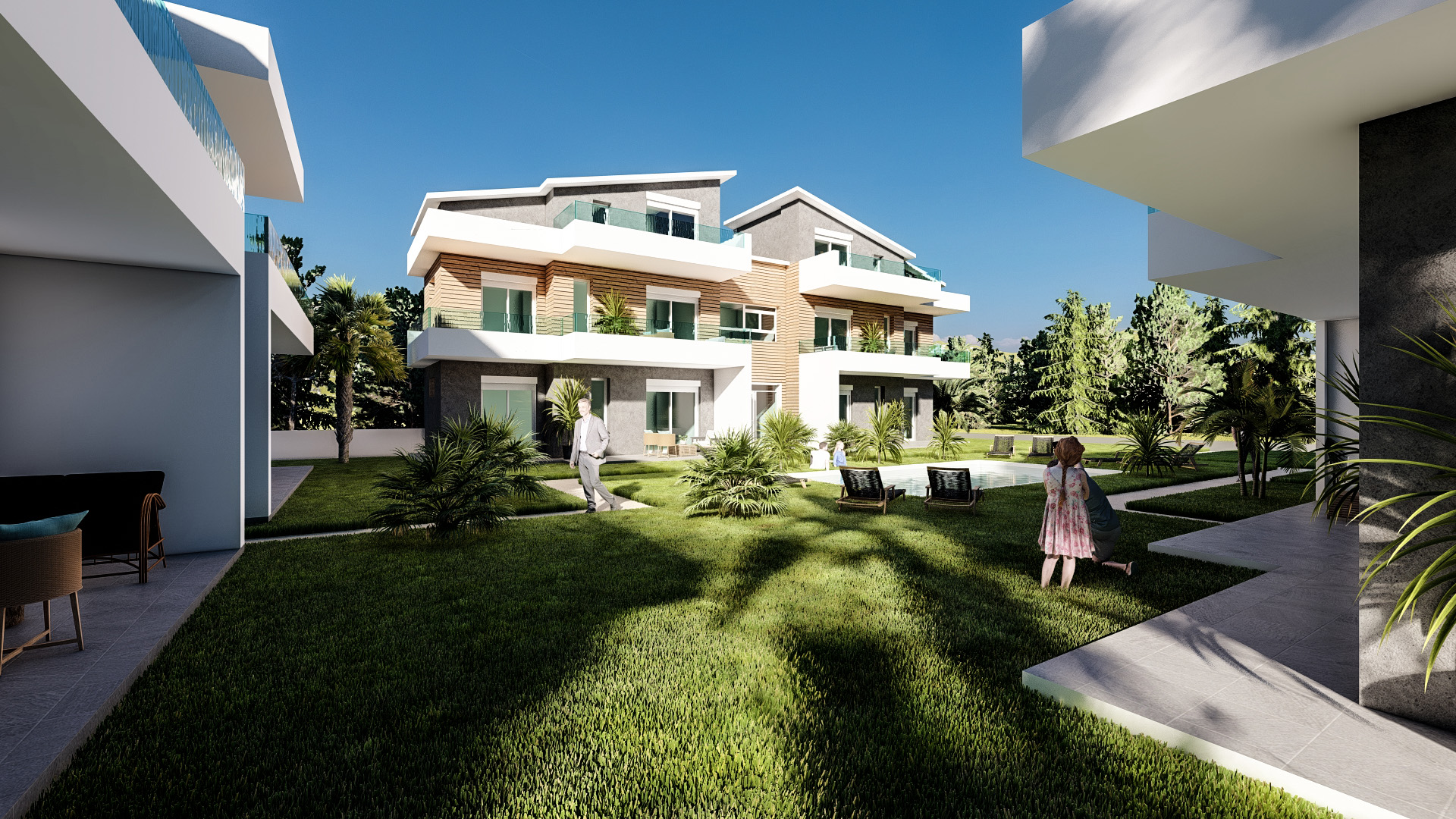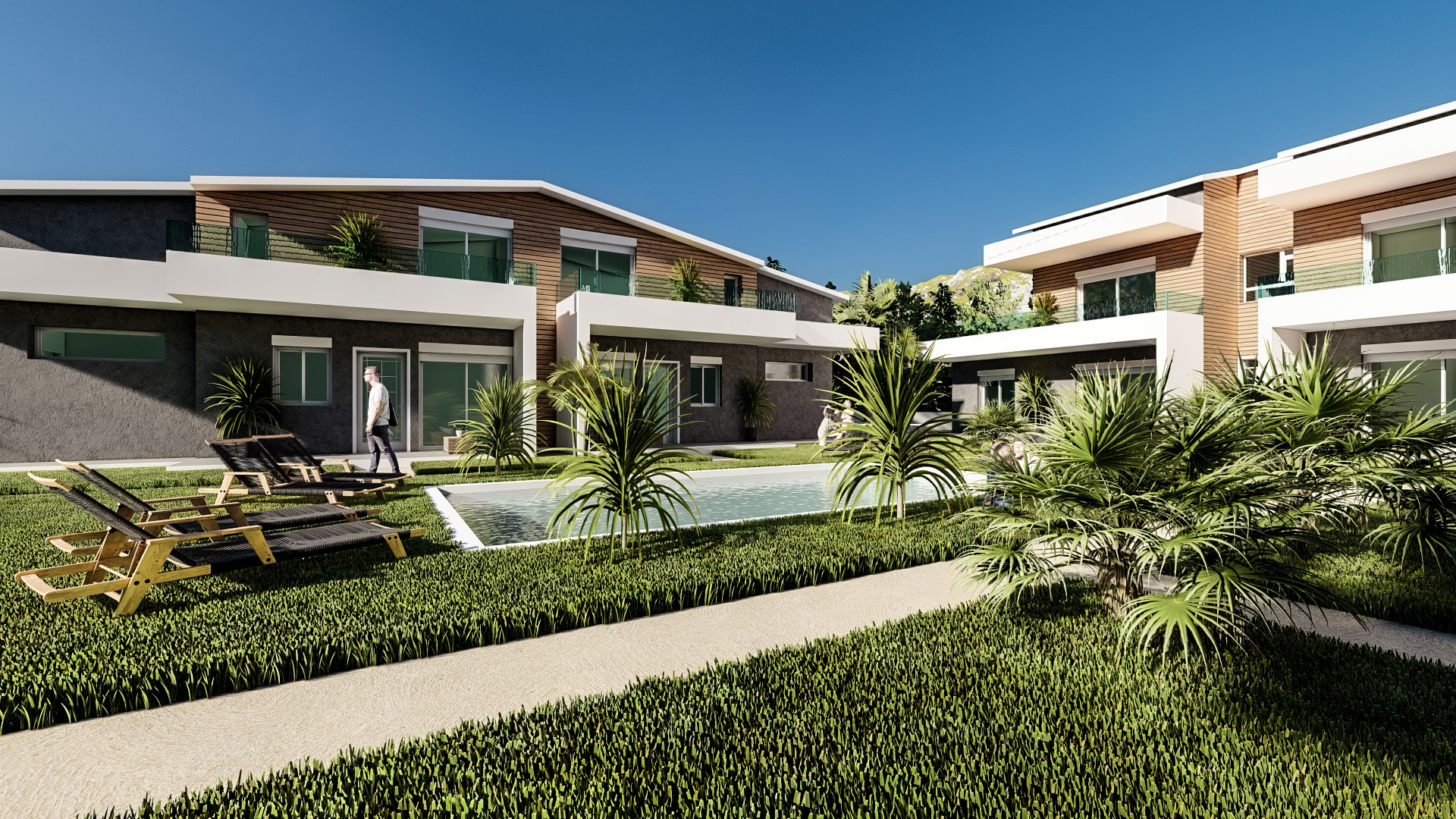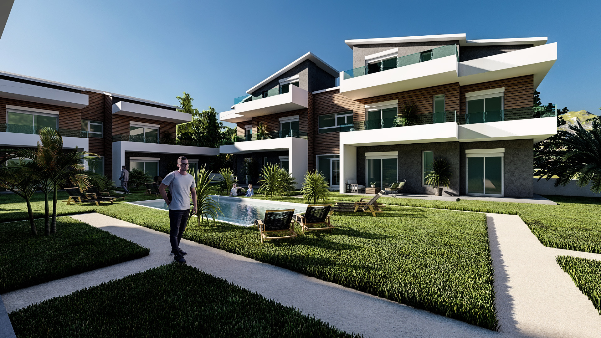 Общий бассейн в центре комплекса создает оазис прохлады и релаксации, дополняя впечатление от внешнего пространства, созданного с учетом функциональности.