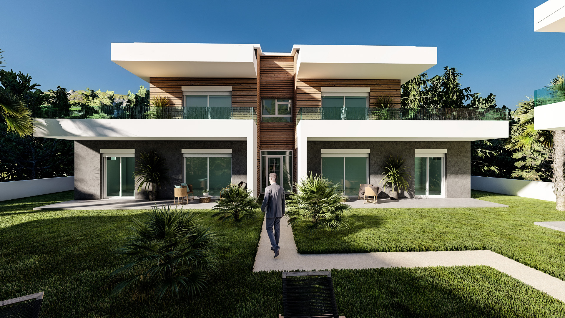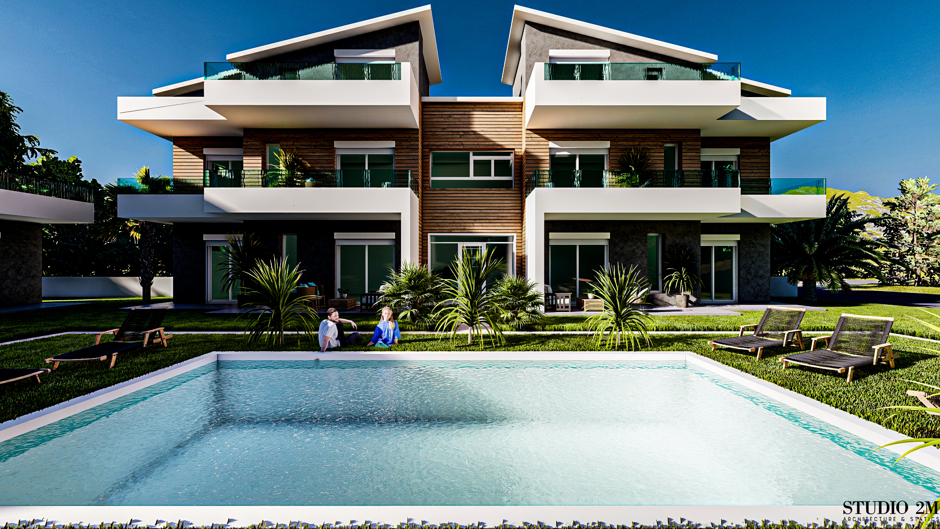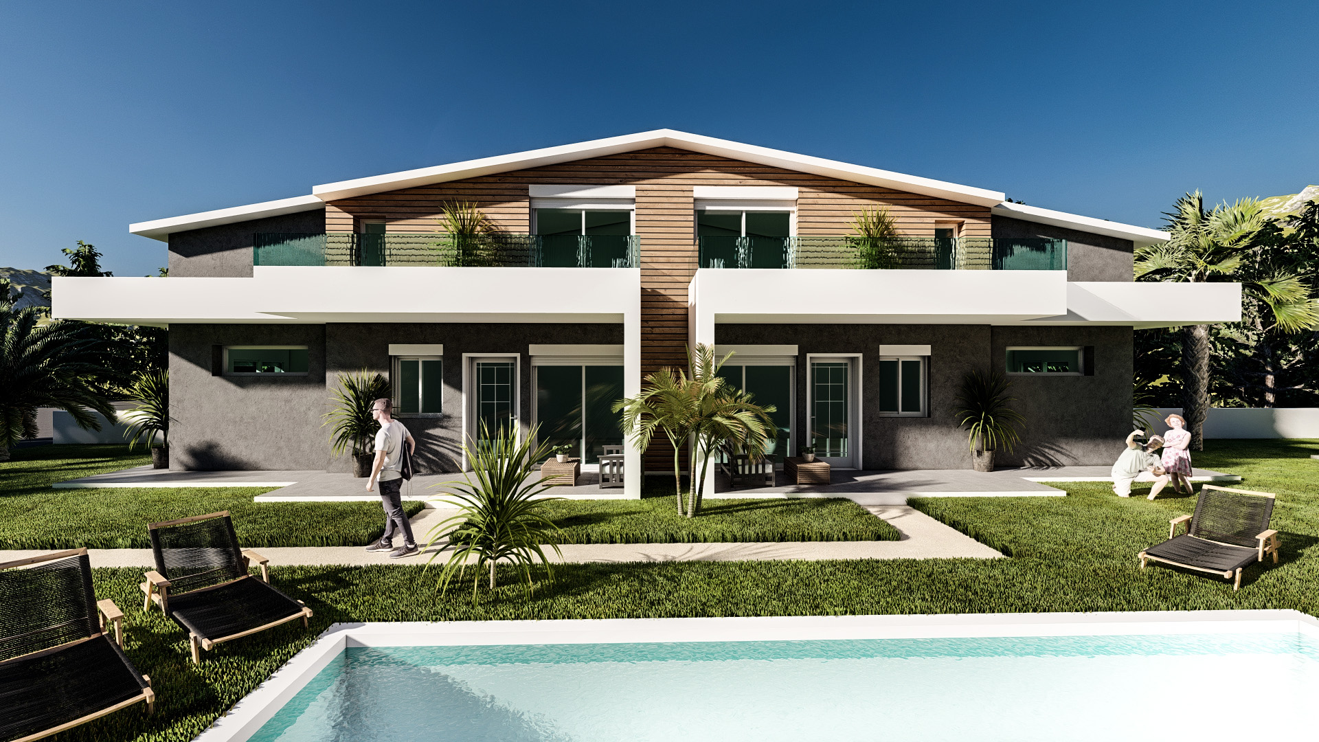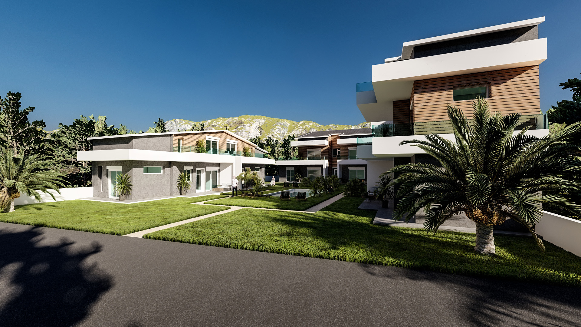 Общий бассейн в центре комплекса создает оазис прохлады и релаксации, дополняя впечатление от внешнего пространства, созданного с учетом функциональности.